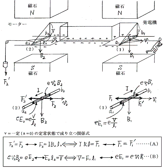 金属棒(1)を引く速度v1は正電荷をa1→b1の方向へ押しやる力ev1B1を生じる。この力が電流Iを生じ、この電流Iが磁場中にある金属棒(2)に力F2を生じる。そのときF2が金属棒(2)に加わっている負荷F2’にうち勝つだけの大きさがなかったら(2)は動けずv2=0で逆起電力ev2B2は生じず金属棒(2)に流れる電流Iはどんどん増大する。電流が増大すればやがてF2はF2’に打ち勝っ大きさになり金属棒(2)は動き出す。加速して速くなりv2が増大するにつれて金属棒(2)の内部にはev2B2の逆起電力が発生してきて電流が流れるのを妨げるようになる。