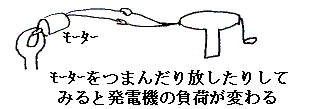 この辺の事情は下図のような実験をしてみればたちどころに実感できる。手回し発電機でモーターを回すとき、そのモーターの心棒を指でつまんだり離したりしてみると手回し発電機に加えるべき力が変化することが分かる。