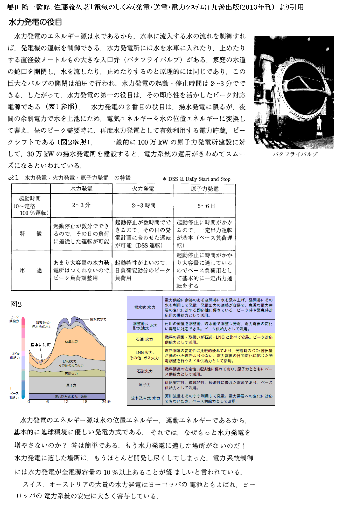 今日、揚水発電の発電能力は全電力会社をあわせて30GW(原発30基分程度)程度ですが、汲み上げるために消費する電力の70%程度しか再利用できないので昼夜の電力差を全て揚水発電で調整するのは経済的ではなく、石油・LNG火力発電の発電量調整と組み合わせて供給電力の調整がなされています。