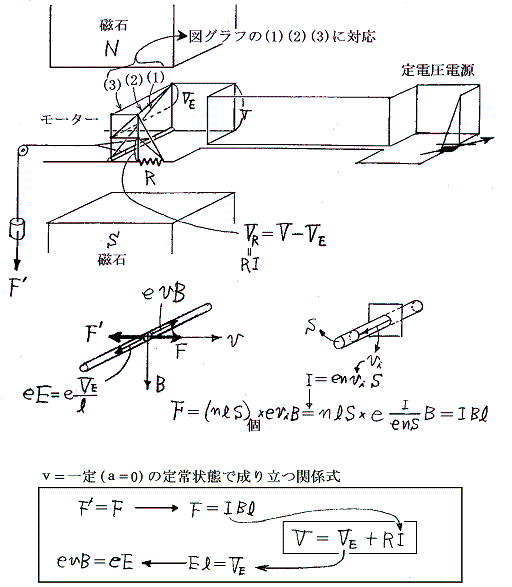 (1)は電流がほとんどゼロの状態で、電圧降下は抵抗Rの中ではほとんど起こらず金属棒中のみで生じる。このときが金属棒中の電圧降下は最大でこれによるeEの力につり合う逆起電力evBも最大にならねばならぬ。そのため金属棒は最大の速度で移動する。しかし電流がほとんどゼロだから発生する力は最小で、外に対する仕事はほとんどなされない。このときエネルギーはほとんど消費されない。