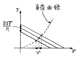 Rがゼロに近づくと共に直線の傾きは負で大きくなり、グラフの直線は垂直に立ってくる(上中グラフ参照)。Rがゼロのとき垂直になる。そのときにはvは電源の供給する電圧Vでほぼ決まり、負荷F’の大きさにはほとんど依存しなくなる。そして電流Iの変動でF’の変化をささえる(上右グラフ参照)。これは前述の3.理想的な定電圧電源と理想的なモーターの場合に近づくことになる。
