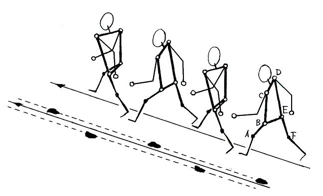 両肩は足の動きと連動して倒れ込むように前後に振れる。そのとき上図のABCDEFがつくる井桁の動きに注意してほしい。脚の動きにつれてたわんでいるが決して捻れてはいない。特にDEFの流れるようなラインに注目してほしい。