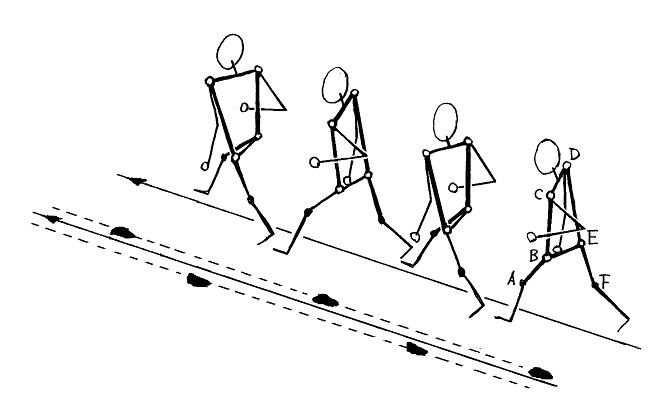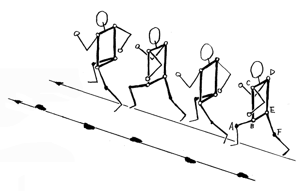 よくナンバ走りは腕を振らない走りといわれるが、腕の振りより上半身特に胸から肩にかけての上部を左右半分に分割して左右を独立に揺り動かしその振れと脚の動きを連動・協調させて走る走り方と思った方が良い。両肩の水平ラインCD、左右の骨盤の水平ラインBE、脚のラインAFは動きにつれてたわむのだが、決してねじるという動作ではない。甲野善紀氏がよく言われる「井桁を崩すような、井桁をたわませるような動き」だ。