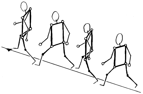 最後にナンバ走りの誤ったイメージについて注意しておく。下の図では肩と足の前後の動きが左右で連動している。この動きが「ナンバ走りは右足を前に出すときには右手を前に出し、左足を前に出すときには左手を前に出す動き。手と足を同時に前に出す動き。」という説明から普通に連想するものだが、これはナンバ的な走りとはまったく関係のない誤った動きである。
