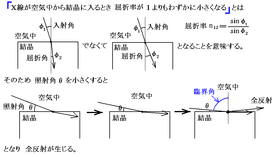 事の発端はX線が空気中から結晶に入るとき屈折率が1よりもわずかに小さくなることが発見されたことにある。これはX線が空気中から固体に入るとき全反射を受けることを意味する。ただし1よりわずかに小さいだけだから全反射の起こる臨界角も大きく90度にちかい。実際λ=1.279×10-10mのX線が密度2.53のクラウンガラスに入射する場合臨界角は89度49秒(照射角は11秒)となる。この発見は臨界角より大きな入射角(非常に小さな照射角=θ)で使うならば普通の光学的な回折格子を反射格子として使って、X線スペクトルが得られることを示した。(1923年コンプトン)