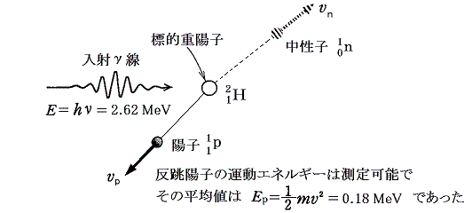 そこでチャドウィック、フェザー、ブレッチャーらはエネルギーの解っているガンマ線(2.62MeV)により重陽子を陽子と中性子に破壊する実験から中性子質量を求めた。この過程は一種の光電効果である。
