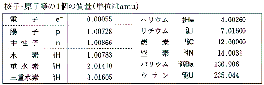 ちなみに現在解っている核子・原子の質量(単位amu)は以下の通りである。原子核質量は原子の質量から電子質量×原子番号を引いたものにほぼ等しい。(原子核と電子の結合エネルギーの質量欠損は無視できるくらいに小さいから)