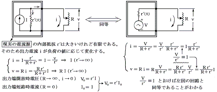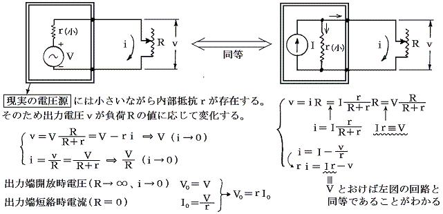 以上の説明からわかるように現実の電源に於いては電圧源と電流源は同等になリ、それらの区別は意味をなさない。要するに内部抵抗が比較的小さい電源を電圧源といい、比較的大きな電源を電流源と言うだけである。
