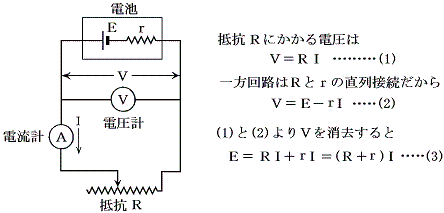 現実の電池は理想的な電圧源(起電力Eとする)と内部抵抗rの直列回路で近似できる。そこで下図の様な回路を組み立てる。ここで電圧計も電流計も理想的なものとする。つまり電圧計の内部抵抗は無限大、電流計の内部抵抗はゼロと考える。