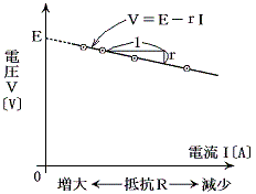 また直線の傾きから内部抵抗rが求まる。ちなみに1.5Vの単一乾電池の内部抵抗は 0.5Ω程度、自動車用鉛蓄電池の内部抵抗は