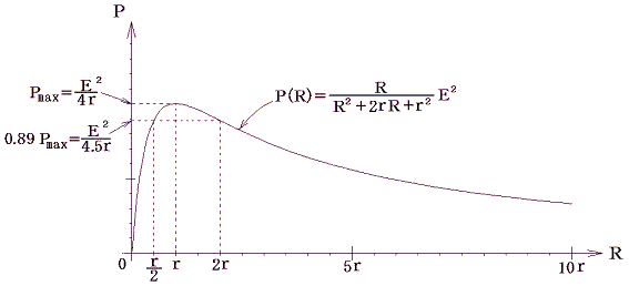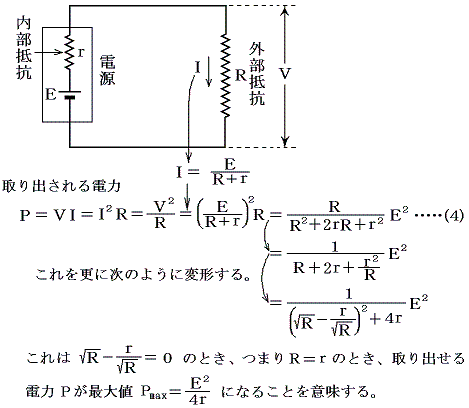 電源には内部抵抗があるため、外に取り出せる電力に制約が出てくる。下図の外部抵抗Rで取り出せる電力はP=VI=I2R=V2/Rだから、電源の内部抵抗が無い場合はRが小さいほど大きくなる。しかし、実際には内部抵抗rがあるためRが小さくなると電源の起電力Eは内部抵抗rに分配され抵抗Rにかかる電圧Vが減少してPが小さくなる。そのためRを小さくしたからといって取り出せる電力が際限なく大きくなることはない。以下で述べるように取り出せる電力には限界がある。