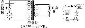 今下図の様に[内部抵抗rの電源]と[負荷抵抗R]を繋いで、負荷で最大電力を取り出すためのインピーダンスマッチングをおこなうためには、巻数比 n:m のトランスを挟み r=R(n/m)2 とすればよい。これを解くと巻数比は n:m=r1/2:R1/2 にすればよい事が解る。
