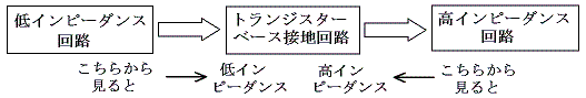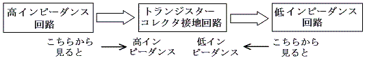 前節のトランスの変わりにトランジスター回路を配置してインピーダンスマッチングをとることができる。別講「ダイオードとトランジスター」で述べたようにトランジスターにはインピーダンス変換機能がある。