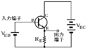 回路の形はエミッタ接地回路と似ているが、出力端子がコレクタでなくエミッタになっており、エミッタホロワ回路とも言われる。コレクタは接地されていないではないかという疑問を持つ人がいるかもしれないが、この回路のVECはコレクタに一定電圧を与える働きだけをしている。そして本講1.(1)で述べたように理想的な定電圧源の内部抵抗はゼロだから回路的にはコレクターが接地されているのと同じである。