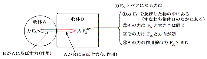 作用反作用の法則とは「AがBに力F(作用)を働かせてると、BはAに同じ大きさで逆向きの力−F(反作用)を同一作用線上で働き返す」と言うものである。しかし、このような言い方ではこの法則の革新性や偉大さが見えてこない。