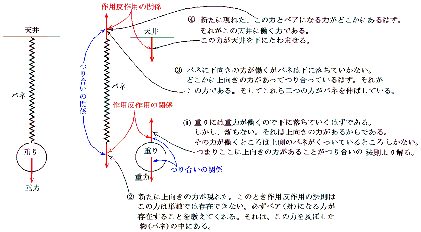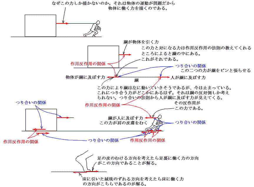 これらのいくつかの例を検討すれば作用反作用の法則(運動の第三法則)は一つの物体から他の別の物体へ力の関係を橋渡しするものであることが解る。つまり一つの物体から次の物体へ力の連鎖が次々に繋がっていることを明らかにし、その連鎖している力の探し方を伝授してくれる法則だ。