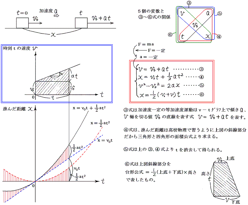 この場合に用いられる数学公式が下記のB〜E式である。これらは単に5つの量v、v0、a、t、x間の幾何学的関係を表す数学公式で普遍的に成り立つ。物理の本質は、aが一定値になるということから、これらの公式が使える状況が整うというところにある。