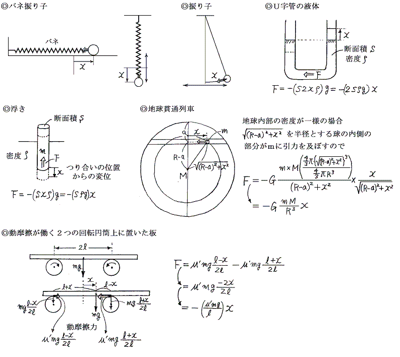 質量に働く力がつり合状態からの変位の大きさに比例する場合で、これもたくさんの応用例がある。