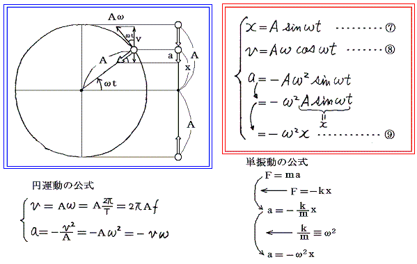 運動が単振動の場合に成り立つ数学公式がF〜Hである。ここ出てくる物理量は変位x、速度v、加速度a、時間t、振幅A、角振動数ω(単振動のもとになった円運動の角速度)の6つである。これらの式の導き方は高校数学で習うので省略する。