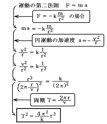 ここでは周期が半径の3/2乗に比例する(“ケプラーの第三法則”)ことだけを注意しておく。これは(4)F