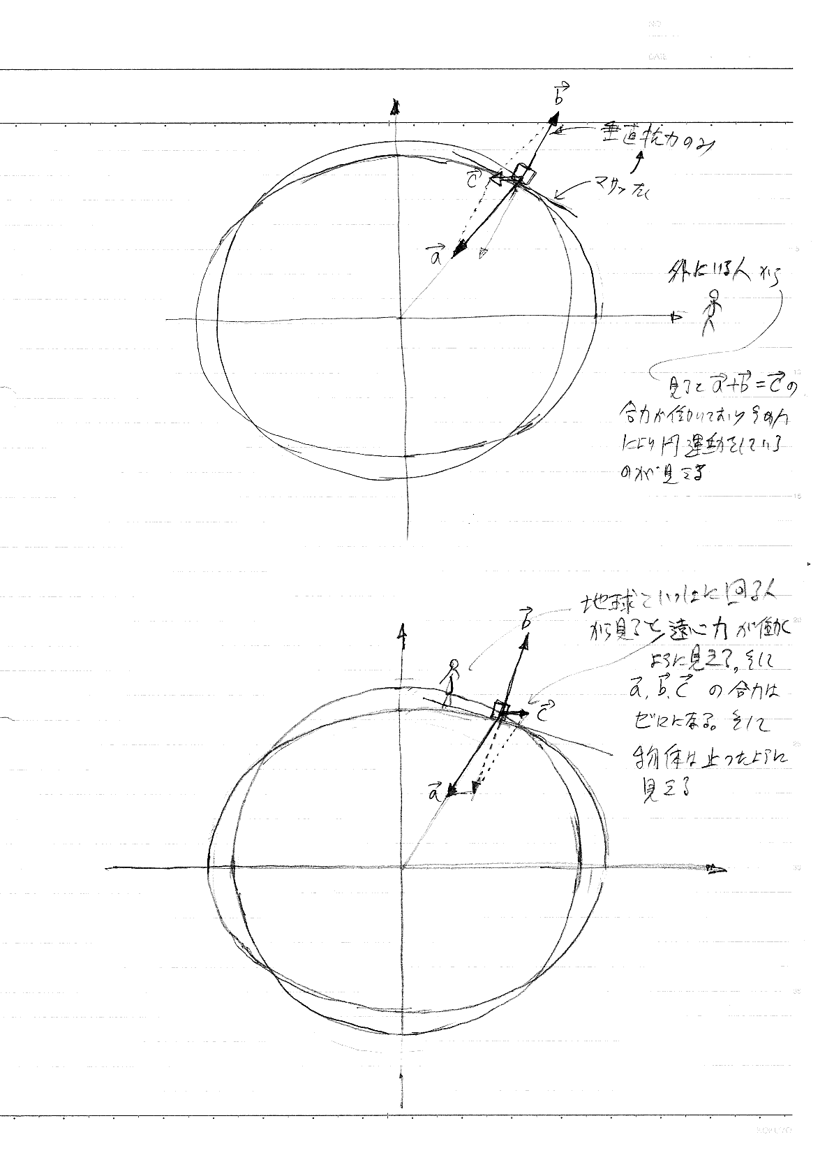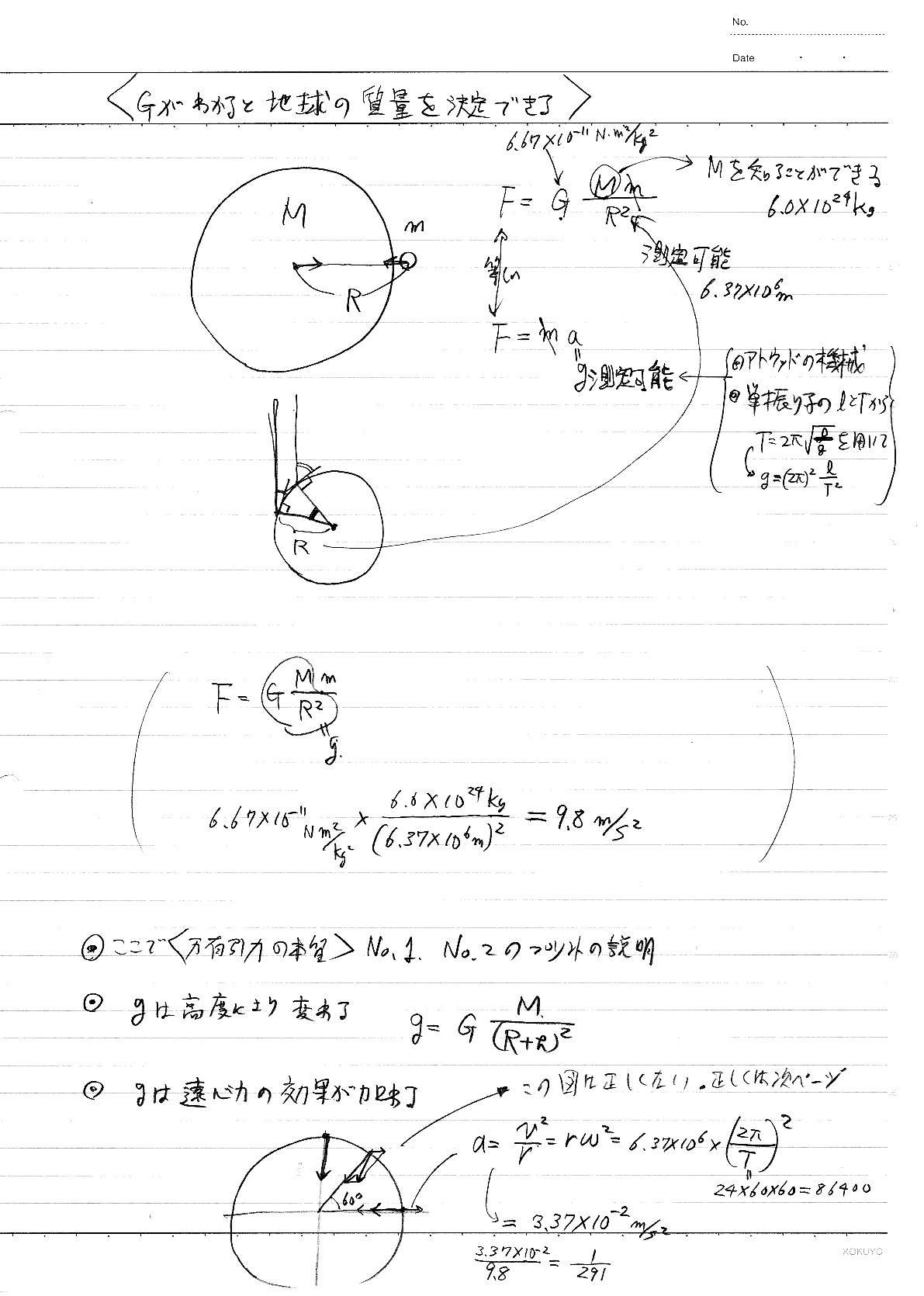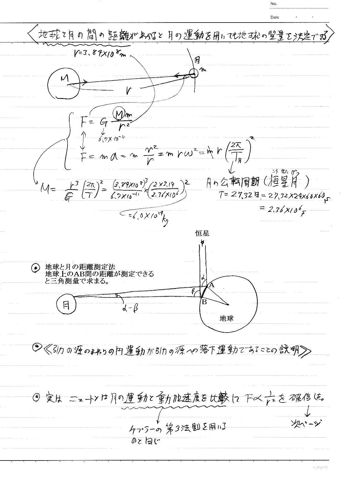 ただし、運動方程式から任意時刻の速度や変位を求めるのに必要な数学は高校レベルを超えるので、高校物理では特別な場合(円運動か直線運動)が簡単に論じられる。そのあたりは授業で習いますが私の高校物理授業ノートから幾つかコピー No.1、 No.2、 No.3、 No.4 します。(他の例を別稿「質点の二次元運動」、「ラザフォードのα線散乱実験と有核原子モデル」、「惑星探査機の軌道と飛行速度」、「楕円軌道の発見と万有引力の法則(「プリンキピア」の説明)」、「楕円軌道とケプラー方程式」、「二体問題」で説明)
