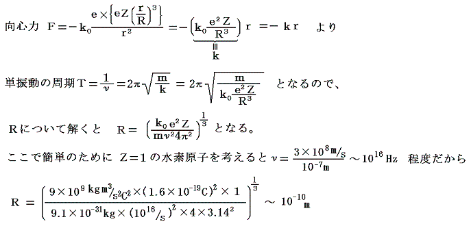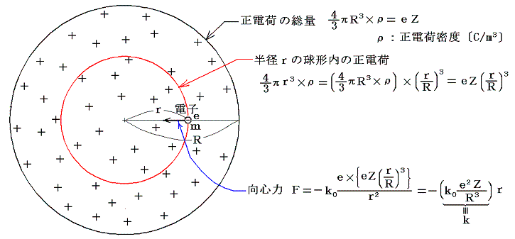 ここで電子に働く向心力に寄与するのは半径rの内側にある正電荷のみである。(別稿「万有引力の法則」(3)を参照)それ故に向心力は距離に比例し、電子の運動は正電荷分布の中心を振動中心とする単振動になる。(別稿「ニュートンの運動法則」3.(4)参照)