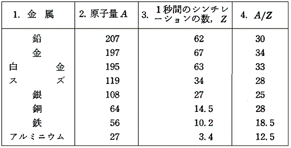 反射されるアルファ線の数は反射金属板の原子番号が大きいほど増加した。(下表参照)