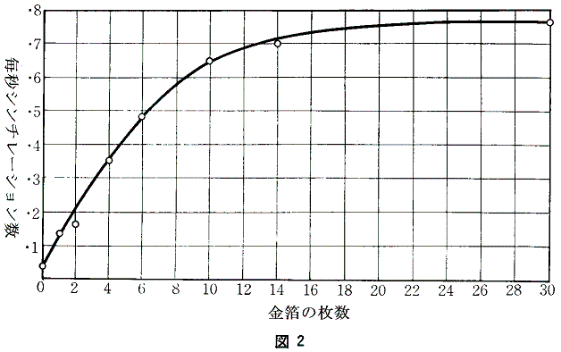 また、薄い金箔(空気に換算して約0.4mm)を反射板として重ねていくと、最初は枚数に比例して反射されるアルファ線の数は増加していくが、20枚ほど(空気厚で8mm)で飽和した。(下図2)