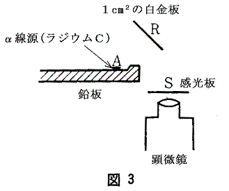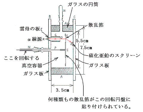 円錐形のガラス容器A、Bにはラジウムエマネーション(ラジウムの崩壊でできる娘核種のラドンのこと。ラドンは不活性ガスでさらにα線を出して崩壊する)が封入されている。Bには雲母の薄膜が張ってある。エマネーションからのアルファ線はこの雲母板を通り抜けて、金属板RRに入射する。SはZnSシンチレータでアルファ線が入射すると入射した点が光る。遮へい板PはBの窓から出てくるアルファ線が直接感光板Sに当たるのを防いでいる。MはZnSが光るのを観察する顕微鏡である。