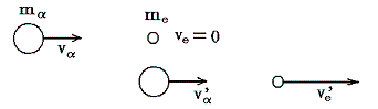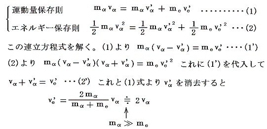 簡単化して質量mαのα粒子が質量meの静止している電子に速度vαで正面衝突する場合を考える。衝突後のα粒子と電子の速度をそれぞれvα’、ve’とする
