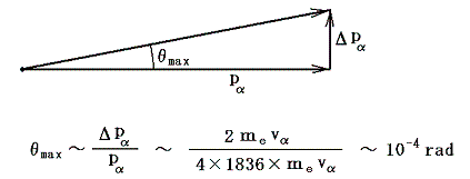 つまり電子の得る運動量は最大でも2mevα 程度であることが解る。つまりα粒子が受ける運動量の変化Δpαは最大でも2mevα 程度である。ところでα粒子が衝突前に持っていた運動量pαはmαvα=4×1836×mevα であるから、この衝突によってα粒子が曲げられる角度の最大値はθmaxはベクトルΔpαがべクトルpαに直角に生じた場合の