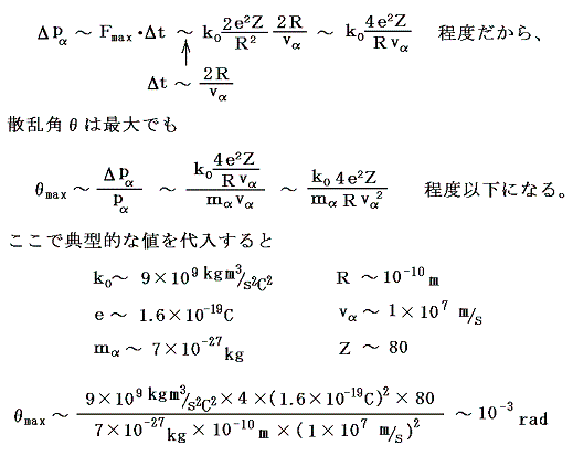 程度となる。これはα粒子が標的の原子層を通り抜けるとき、電子との衝突を繰り返しても、原子層を通り抜けた後曲げられる角度θはごく小さなものであることを意味する。