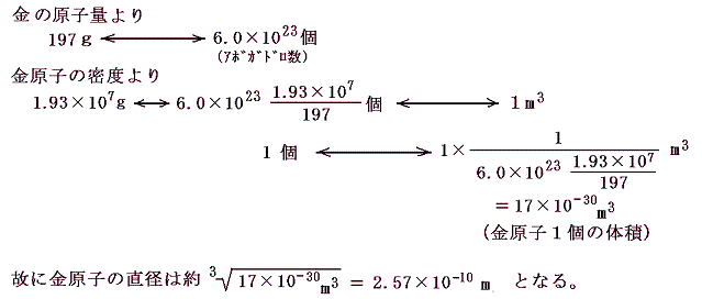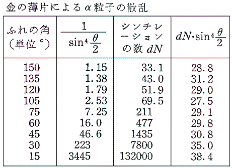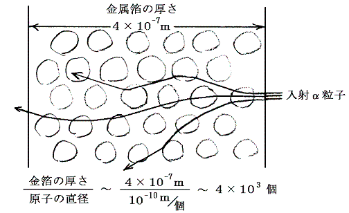 ところでガイガーやマースデンが用いた金箔(厚さ4×10-7m)では約20000回に1回の割合で大角度散乱が起こった。ところで金原子の大きさは、金原子の密度と当時知られていたアボガドロ数をもちいると