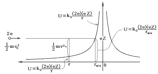 これら3つの仮定が成り立つとして、α粒子がeZの正電荷にどれくらい近づくことができるのか見積もってみよう。α粒子(電荷2e)が、電荷eZのかなり重い(金原子の質量程度、α粒子の197/4倍)質点に、初速v0で正面衝突してもと来た方向へはね返される場合にα粒子と電荷eZ最も近づいたときの距離rminを求める。このときeZの質量中心はα粒子よりはるかに重いから、ほぼ静止しているとしてよい。