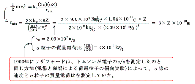 この結論から明らかなように、eZが電子の数百倍の電気量であったとしても、最接近距離rminは10-13m以下となる。これは当時、原子の大きさとして知られていた10-10mの1/1000以下である。