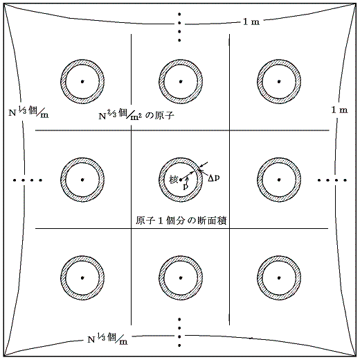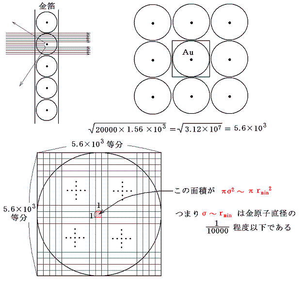 20000回に1回の割合で大角度散乱がおこったのは1.56×103層に並んだ金箔での割合だから、ただ一層からなる金箔なら20000×1.56×103回に1回の割合になる。つまり金原子の断面を20000×1.56×103等分に分割したその内の1つ分の面積が前述のπσ2〜πrmin2の面積ということになる。