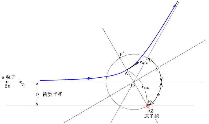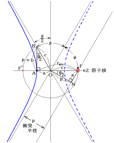α粒子は質量中心eZから距離p(衝突半径)離れた位置を入射してきて、角度θだけ偏向した方向へ散乱されたとする。そのとき最接近点Aと焦点Fの関係は下図のようになる。