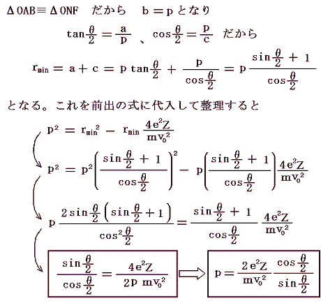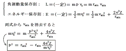 今簡単化のために、α粒子が入射する最初の状態と、質量中心eZに最も近づいたときに対して運動量保存則とエネルギー保存則を適用しよう。質量中心に最も近づいた位置は双曲線軌道の対称性を具現する点だから様々な関係式を利用するのに都合がよい。その場合関数形を直接取り扱わなくても、軌道が双曲線軌道になるという事実から利用できる対称性を用いて重要な結論が導ける。