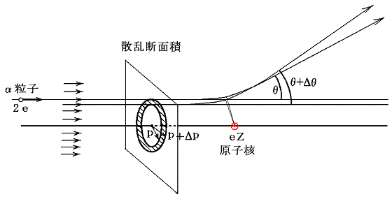 円盤の面積はπ×(半径)2で与えられるから、α粒子が単位時間に角度θとθ+Δθの間に散乱される数は円環の面積=π(p+Δp)2−πp2に比例するであろう。今単位体積当たりN個/m3の散乱体原子があるとする。そして、単位時間、単位面積当たりn個/m2のα粒子が入射してくるとする。