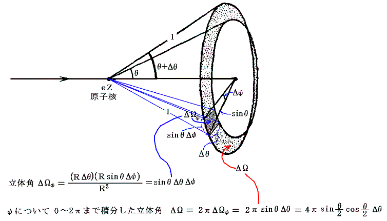 ここでΔθの角度間隔に散乱される数を、立体角θ〜θ+Δθ当たりに散乱される数にするには、立体角が
