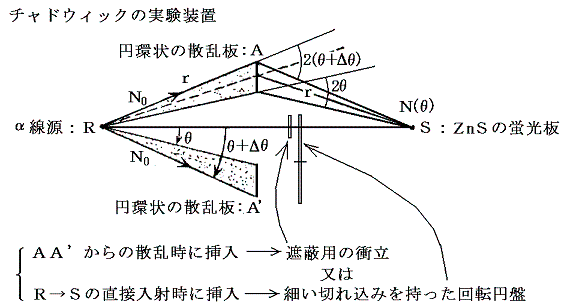 6.(5)項で述べた核電荷の正確な測定は1920年に弟子のチャドウィックによってなされた。すでに述べたように、α線の散乱実件において、単位時間にθ〜θ+Δθの立体角に散乱されてくるα粒子の数dnは