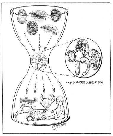 彼は「個体発生の初段階において、短時間にわれわれの眼前に起こる諸変化は、その生物の祖先が、その古生物学的発展の間に長い年月をかけてゆっくりと経過した諸変化の短いくり返しにほかならない。」と述べている。