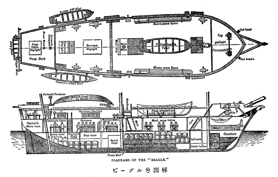 航海記の章立てと、挿絵の一部を抜粋して示す。(島地威雄訳「ビーグル号航海記(上、中、下巻)」岩波文庫 より)