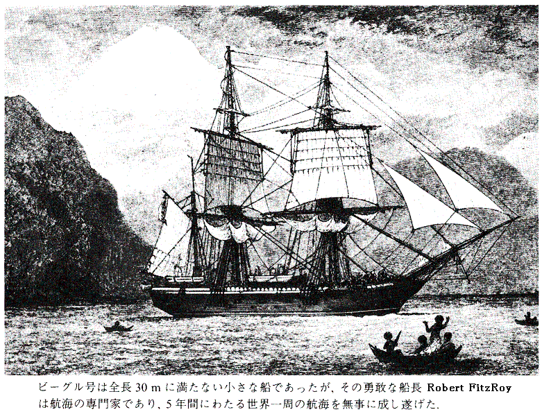 ビーグル号は絵のような3檣バーク型帆船です。バーク型とは最後尾の檣が縦帆でそれ以外の檣には横帆を展帆するものです。