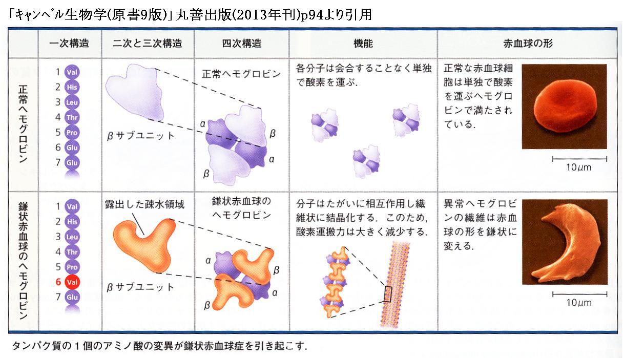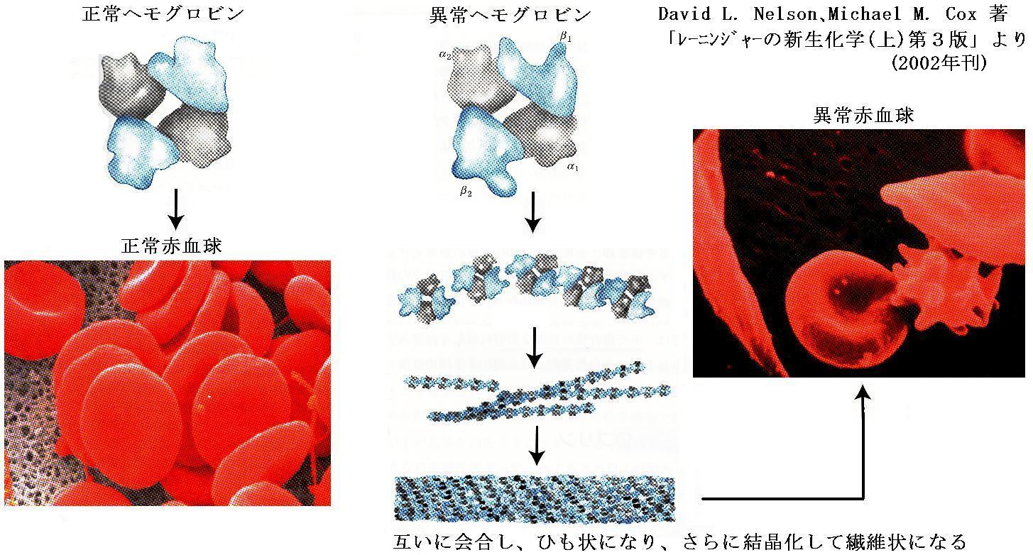 この置換によりβ鎖の立体構造が変化する。さらに血漿のpH域では、グルタミン酸は負電荷を持つがバリンは電荷を持たない。このために異常ヘモグロビンのβ鎖の6位の位置(これは分子の外表面にある)に疎水結合性を持つ接触点が現れる。そのため酸素が外れた状態のヘモグロビン分子は相互に会合して繊維状の集合体に凝集してしまう。それが赤血球を鎌状に変形させる。