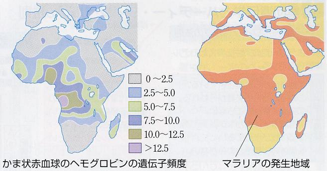 ヘテロ接合個体の致死性マラリアに対する抵抗性が、ホモ接合の有害性に対してバランスを取り、赤血球異常に伴う貧血症の不利益にもかかわらず、マラリアの蔓延地帯でこの遺伝子が保存されてきた。上図は両者の分布に強い相関があることを示している。また、マラリアの存在しないアメリカにおいては、アフリカ系アメリカ人からもその遺伝頻度は減少している。