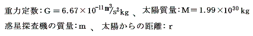 とする。また、簡単化して惑星は全て円軌道を回転するとする。そして各惑星の重力ポテンシャルの寄与は全て無視して、太陽の重力ポテンシャル場の中での飛行を考える。惑星の質量は太陽の質量の1000分の1以下だから、ここでの考察のようにおおざっぱな値を見積もるときには無視しても問題ない。そのため計算値は実際の値とは少し異なる。