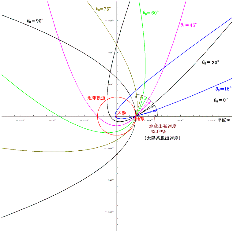 これに対して、上記の放物線軌道の場合は、到達動径距離の最大値は太陽から無限遠の彼方だから、出発時に持っていた角運動量成分が異なっていて、無限の彼方での角運動量が有限でも、無限遠での話しだから動径に垂直な速度成分はゼロと見なせる。もちろん動径方向の速度成分もゼロに成って良いのだから、最初持っていた運動エネルギーを全て位置エネルギーの獲得に使えることになる。そのため放物線軌道や双曲線軌道が取れる初速度で出発した場合は、太陽に対して任意の方向に向かって出発しても最終的に無限遠の彼方へ到達できる。次に上記脱出速度(42.1km/s)で様々な角度に打ち出したときに、たどる放物線軌道の様子を図示する。