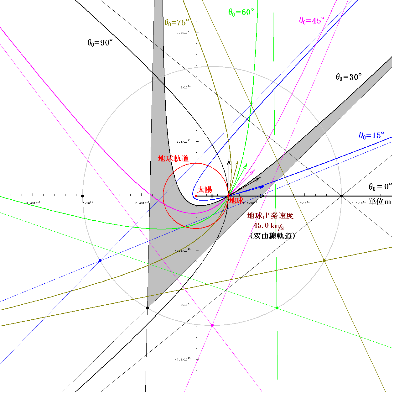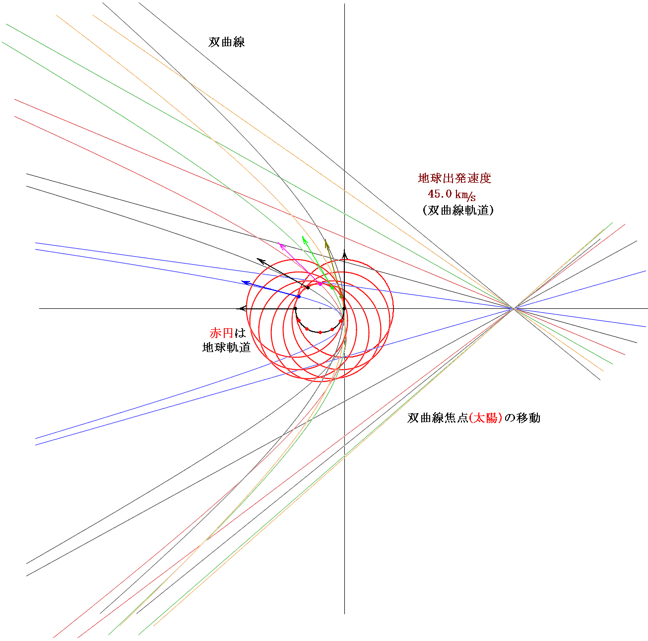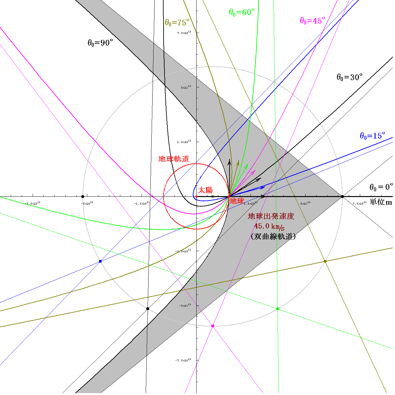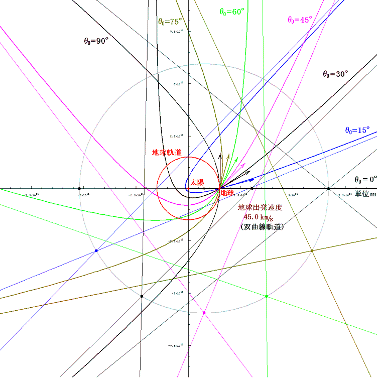 次に、太陽系脱出速度よりも大きな速度45km/sで打ち出したときに取る双曲線軌道を示す。