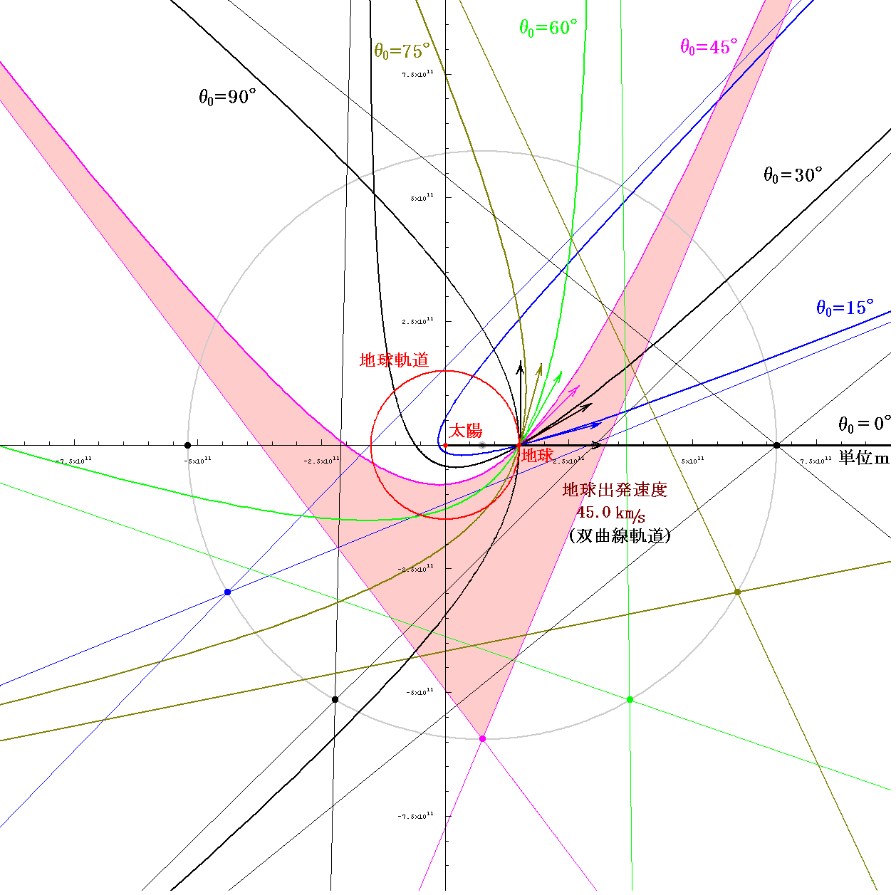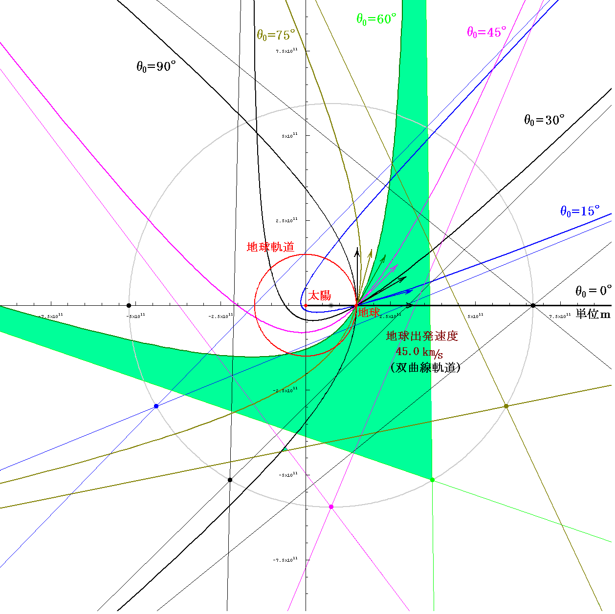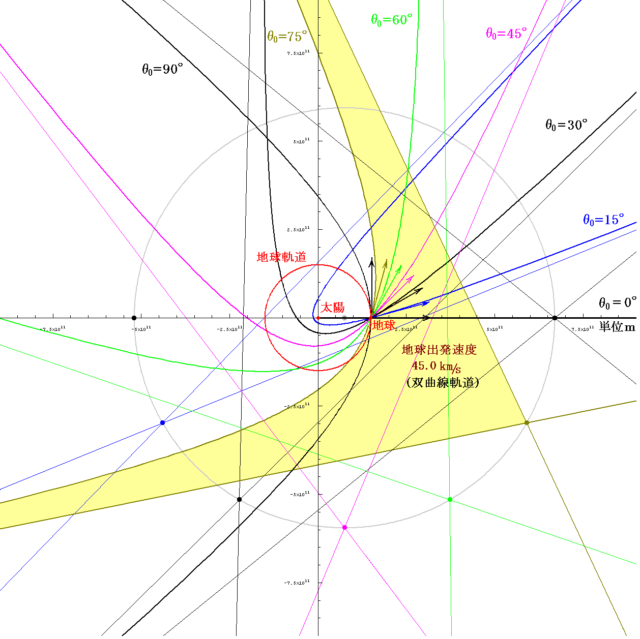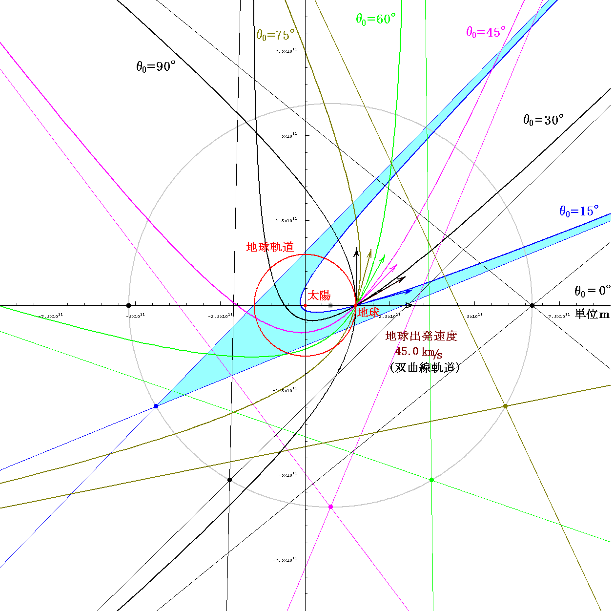 次に、太陽系脱出速度よりも大きな速度45km/sで打ち出したときに取る双曲線軌道を示す。